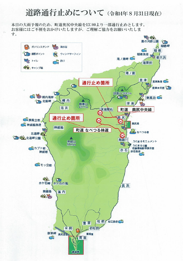 【奥尻島】大雨による通行止めのお知らせ(奥尻中央線)(9/14追記)